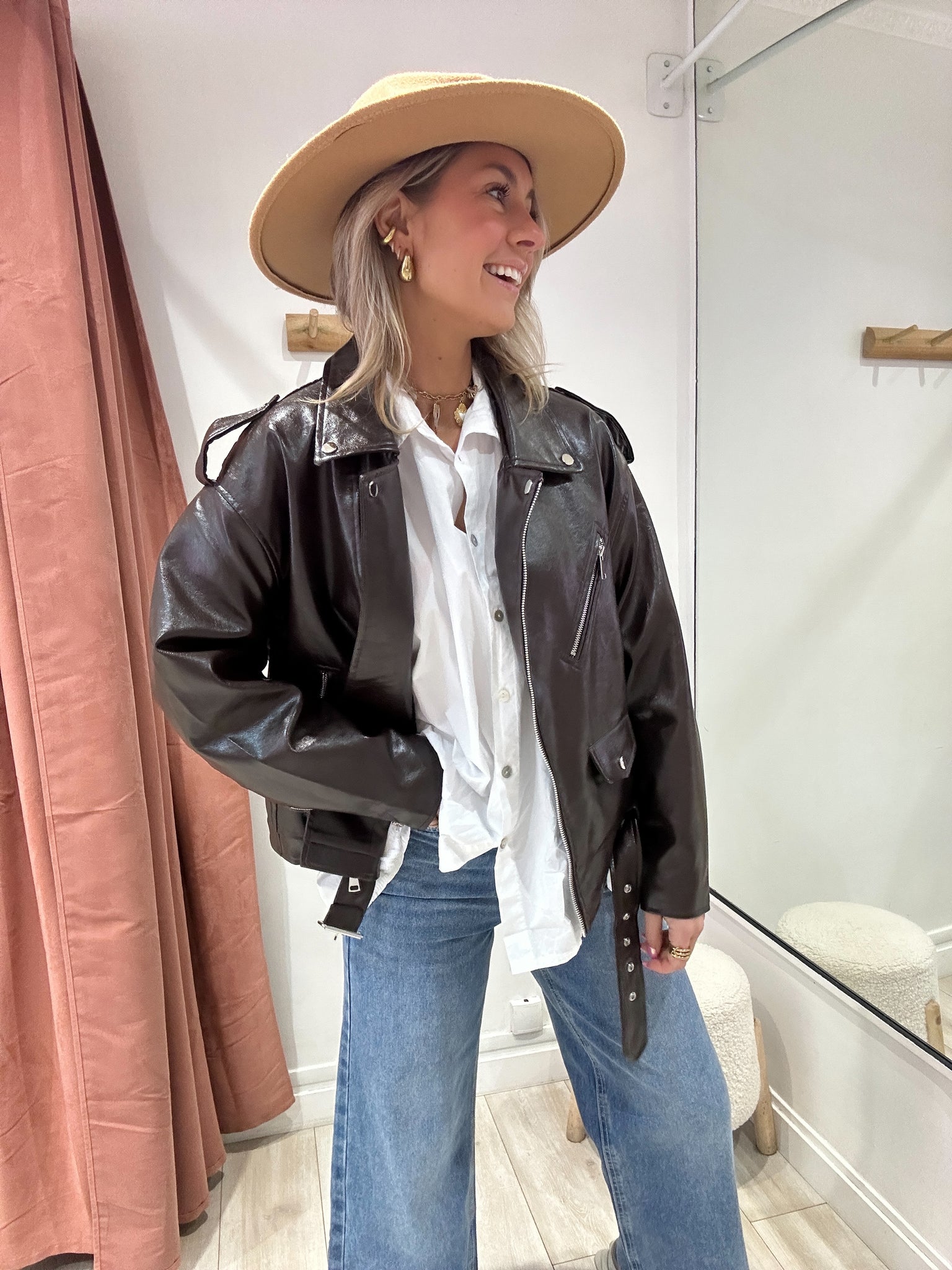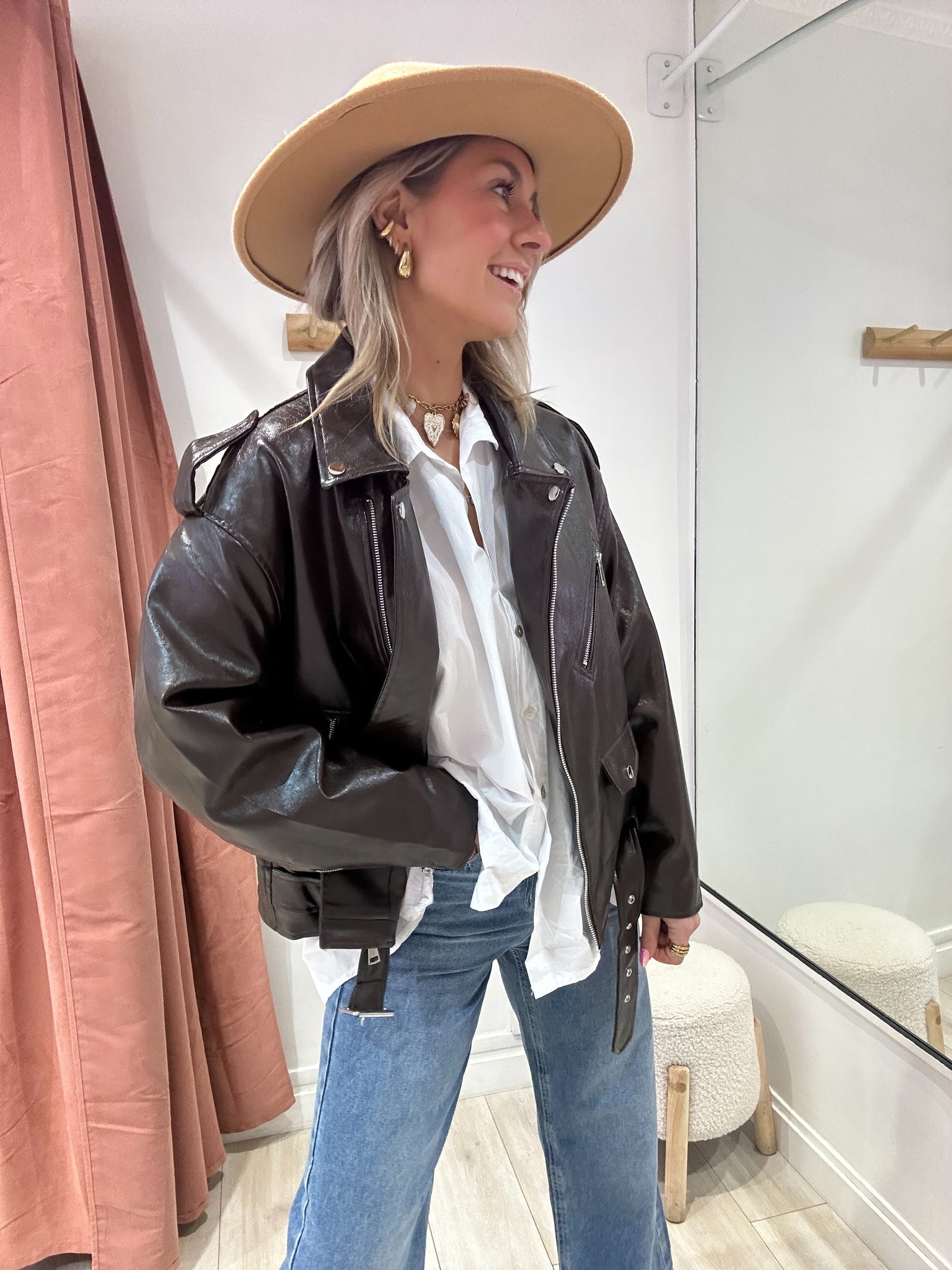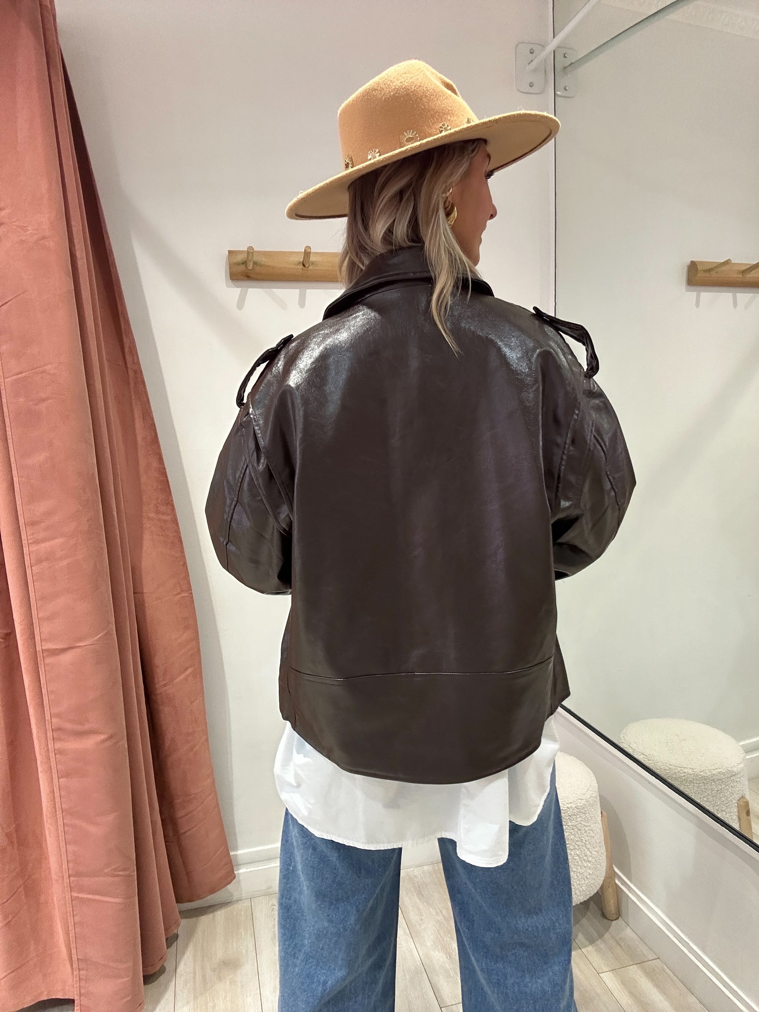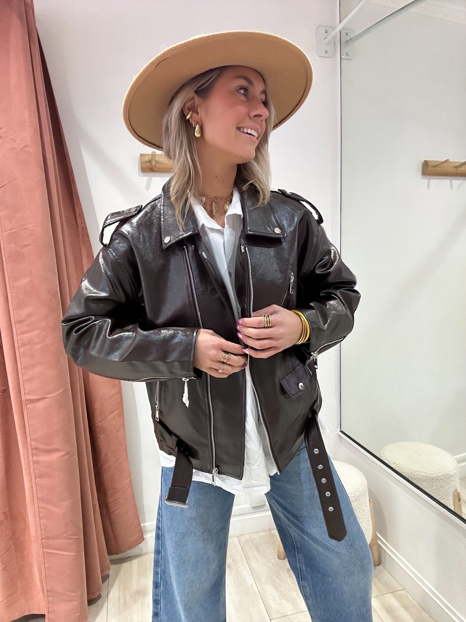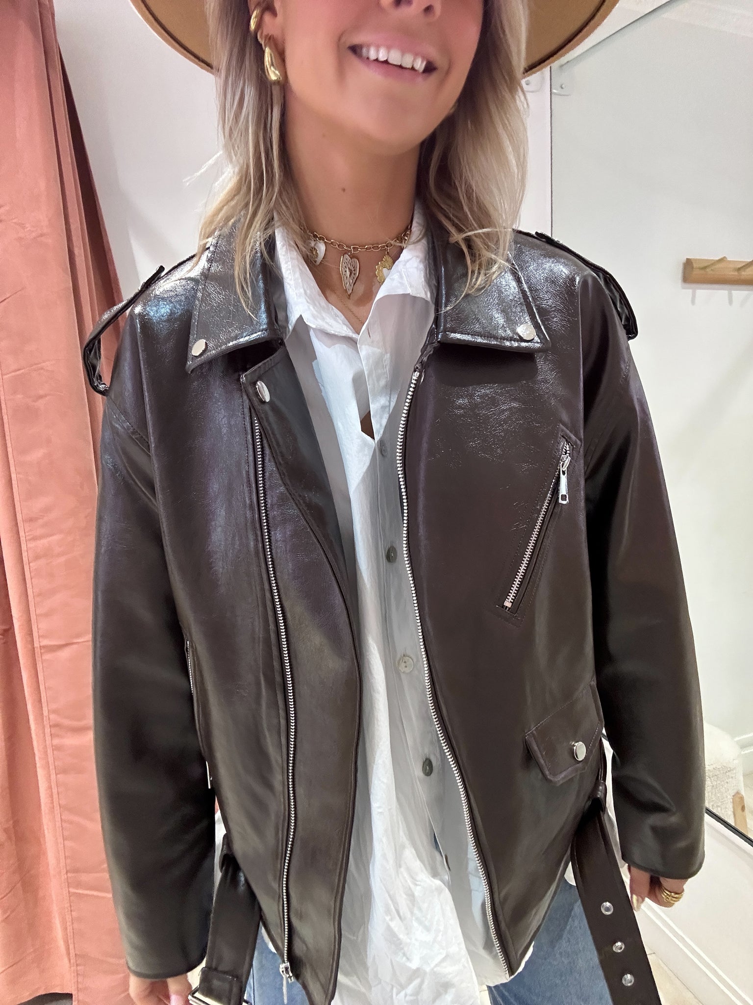 Perfecto marron en similicuir vernis