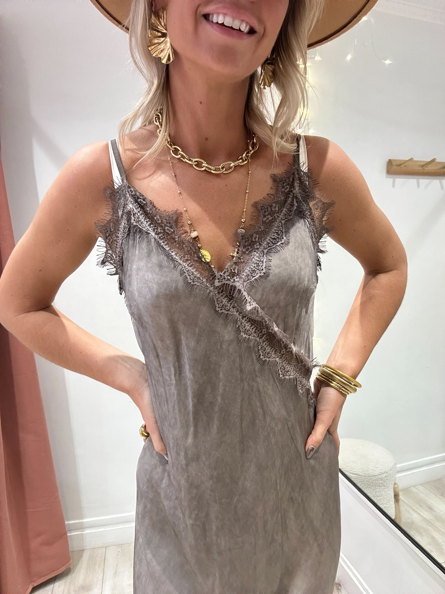 Robe taupe satinée avec détail en dentelle