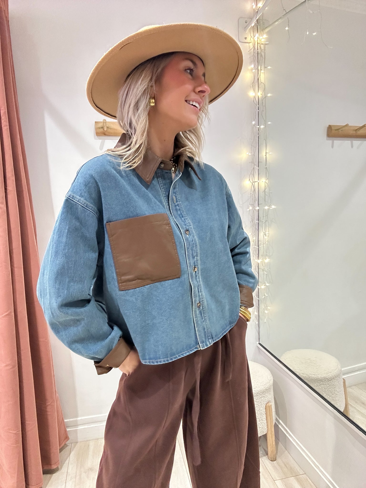 Détails similicuirs camel sur la poche avant, au col et aux poignets